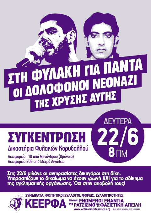 Χρειάζεται να δώσουμε μαζικό παρών στην αντιφασιστική συγκέντρωση στις 22 Ιούνη στις 8πμ έξω από τις φυλακές Κορυδαλλού.