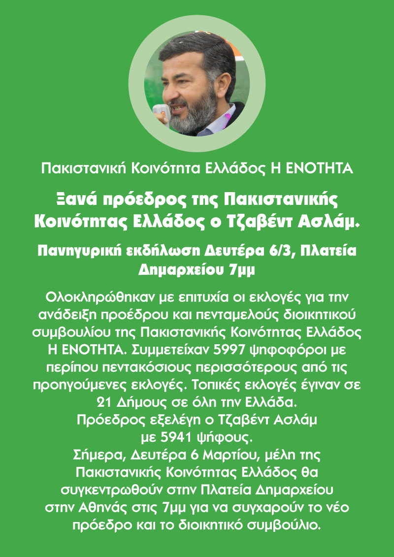Σήμερα, Δευτέρα 6 Μαρτίου, μέλη της Πακιστανικής Κοινότητας Ελλάδος θα συγκεντρωθούν στην Πλατεία Δημαρχείου στην Αθηνάς στις 7μμ για να συγχαρούν το νέο πρόεδρο και το διοικητικό συμβούλιο.