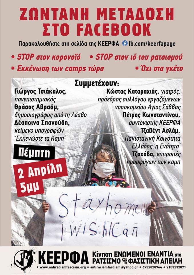 Eκδήλωση της ΚΕΕΡΦΑ την Πέμπτη 2/4 ςτις 5μμ στο διαδίκτυο με Live μετάδοση απο τη σελίδα μας στο FB https://www.facebook.com/keerfapage/ με συμμετοχή: Γιώργος Τσιάκαλος, πανεπιστημιακός, Θράσος Αβραάμ, δημοσιογράφος Λέσβος, Δέσποινα Σπανούδη,”κείμενο υπογραφών εκκενώστε τα καμπ”, Kώστας Καταραχιάς, γιατρός- πρόεδρος Σωματείου εργαζόμενων νοσοκομείου Αγιος Σάββας, Πέτρος Κωνσταντίνου, συντονιστής ΚΕΕΡΦΑ, Τζαβέντ Ασλάμ, Πακιστανική Κοινότητα Ελλάδος “η Ενότητα”, Τζοχόβα, επιτροπές προσφύγων από τα καμπ.