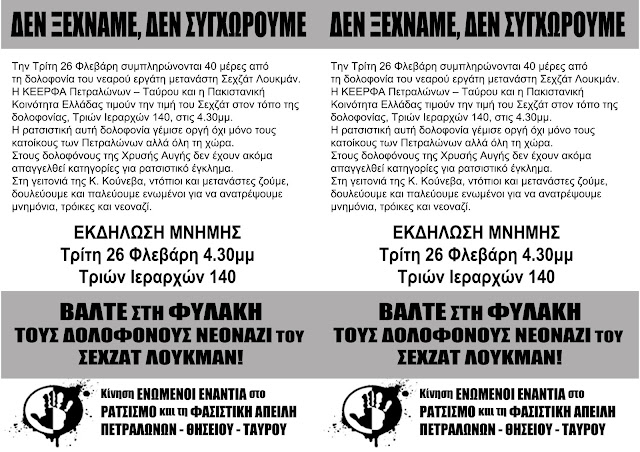 Ρατσιστική βία σε βάρος μεταναστών στην Νίκαια Αντιφασιστική εκδήλωση, Πέμπτη 12/7, Πλατεία Μέμου 7.30μμ, σε Νίκαια-Κορυδαλλό