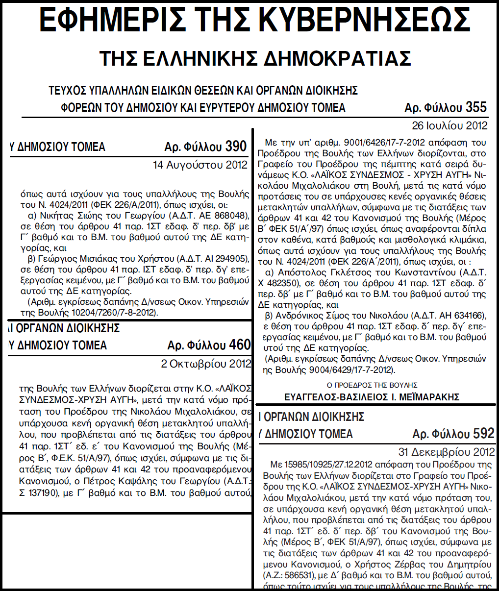 3. Από τον προϋπολογισμό της Βουλής θα συνεχίσουν να αμείβονται οι “επιστημονικοί συνεργάτες” των βουλευτών της Χρυσής Αυγής (1 ή 2 για καθέναν από τους 18). Τα ονόματα των επιστημονικών συνεργατών μένουν δυστυχώς αδημοσίευτα, αλλά είμαστε σε θέση να γνωρίζουμε ποιό είναι το “επιστημονικό έργο” που παράγουν. Ο Ιωάννης Ανδιόπουλος, ο φασίστας δικηγόρος που στράφηκε με προσφυγή κατά του νόμου για την ιθαγένεια των παιδιών των μεταναστών, είναι έμμισθος “επιστημονικός συνεργάτης” βουλευτή της Χρυσής Αυγής και πληρώνεται για τη βιομηχανία διώξεων κατά της Αριστεράς και του αντιφασιστικού κινήματος: είναι ο μηνυτής της Εργατικής Αλληλεγγύης, συγκεκριμένα του εκδότη της Τάσου Αναστασιάδη, του διευθυντή Πάνου Γκαργκάνα και της δημοσιογράφου Κατερίνας Θωίδου (επειδή τον αποκάλεσαν “φασίστα”!), καθώς και του δημοτικού συμβούλου Αθήνας και συντονιστή της ΚΕΕΡΦΑ Πέτρου Κωνσταντίνου. Ως πότε θα σπαταλάει χρήματα το ελληνικό δημόσιο για τούτο το “επιστημονικό έργο”;